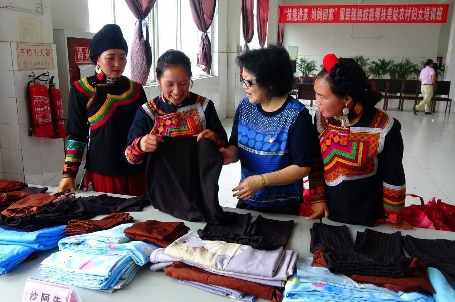 胡英通过对留守儿童的调查了解到,只有爸爸妈妈实现就业,才能留在孩子身边,还留守儿童一片蓝天。为此她带领瑞鸽公司关工委实施“技能进家、妈妈回家”缝纫公益培训项目,重点为美姑县、金口河区、峨边彝族自治县困难家庭妇女免费培训服装缝纫、裁剪、绣花等技能。依托公司服装出口企业的优势,按照“培训+订单”模式,帮助她们实现居家灵活就业,至今已开班8期,培训彝族地区妇女300余人。参加第一期学员阿尔阿洛在美姑县城开起了自己的彝秀服装店,如今月收入已达9000多元。