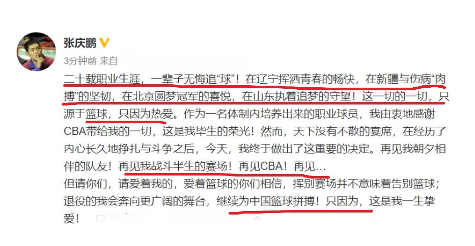 然而,天下没有不散的宴席,时光它总会流逝,曾经年少轻狂、充满活力的张庆鹏,现在已经来到了39岁,经过长时间的内心挣扎,张庆鹏做出了人生一个重要决定,那就是与奋斗了半生的赛场说再见,再见CBA!再见了朝夕相伴的队友。在此,也是祝福张庆鹏,接下来去书写新的人生。值得一提的是,张庆鹏表示,挥别赛场并不意味着告别篮球,在退役之后,会继续为中国男篮去努力拼搏,因为,篮球是自己一生的挚爱!