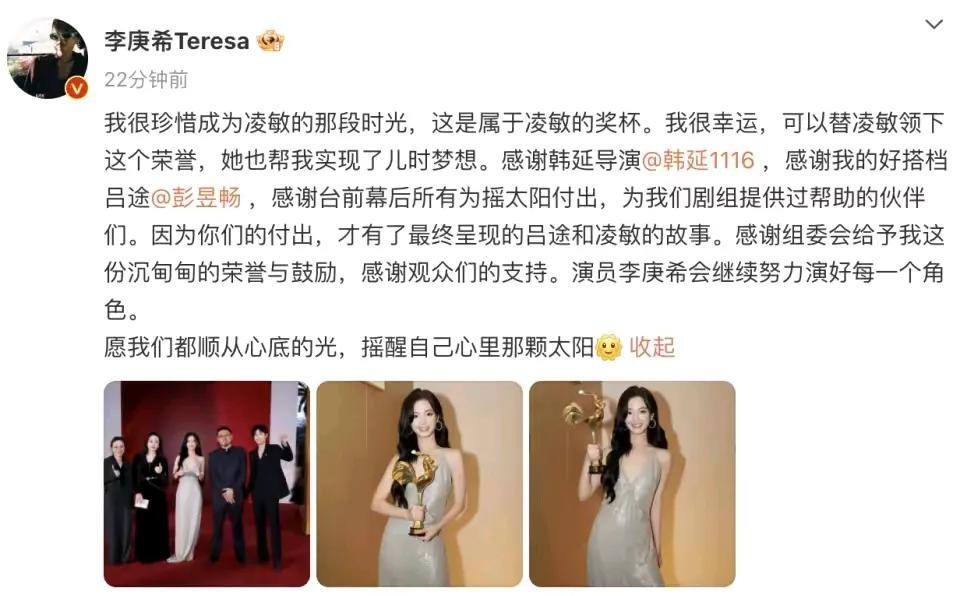 网友们在网上那可是吵翻了天。有人说:“这李庚希凭啥拿奖啊?就因为她后台硬?” 还有人吐槽:“难道现在的金鸡奖不看演技,只看谁有关系了?” 大家对这种所谓的“资源咖”现象那是讨厌得要命。在他们看来,演员就应该靠自己的本事吃饭,靠演技说话。像那些真正有实力的演员,可能辛辛苦苦奋斗一辈子都不一定能拿到这么个大奖,可李庚希却轻松捧杯,这不是在打那些努力演员的脸吗?