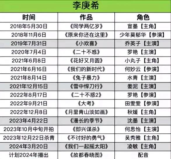 说起李庚希,这妹子的经历那可真是像开了超级无敌挂一样。她可不是从啥专业表演学校出来的演员,演技也没在专业院校里好好地练过。可人家就是资源多得不像话!年纪轻轻,主演的影视剧一部接着一部。16 岁的时候,别人还在苦哈哈地跑龙套,打酱油,她却已经稳稳当当坐上了女主角的宝座,首部电视剧《同学两亿岁》就挑大梁。据说这都靠她老爸和徐静蕾关系好。这就好比你在游戏里还在新手村艰难地挣扎,人家却直接拿着顶级装备到处横冲直撞,能不让人心里酸酸的吗?
