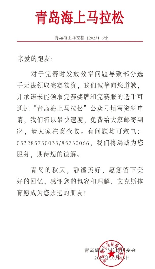 10月15日傍晚,青岛海上马拉松组委会发表致歉声明,称对于完赛时发放效率问题导致部分选手无法领取完赛物资,诚挚道歉,并承诺未能领取完赛奖牌和完赛服的选手可通过“青岛海上马拉松”公众号填写资料申请,将以最快速度,免费给大家邮寄到家,并公布了联系电话。