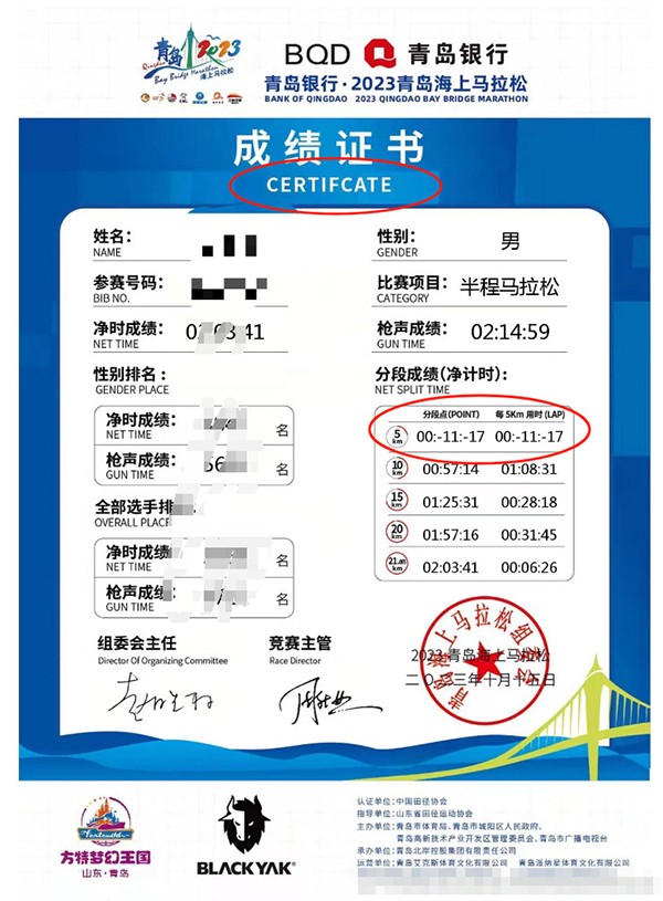 网友晒出的2023青岛海上马拉松成绩证书(图片来源网络)