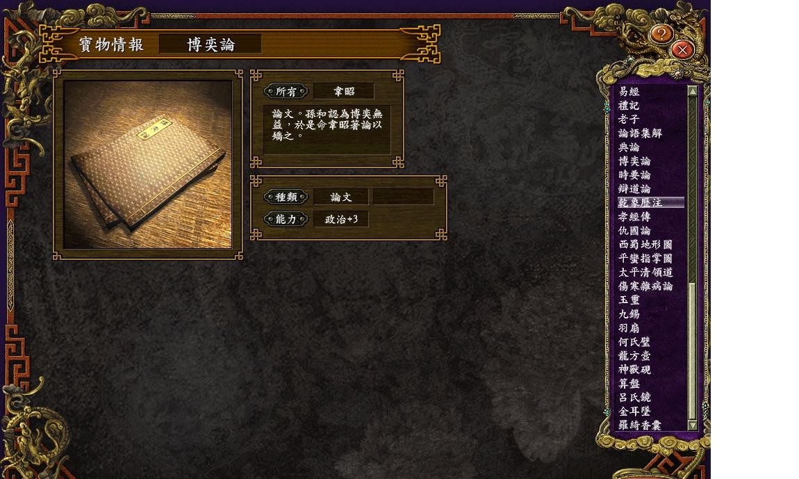 宝物在游戏中的作用不止于战斗,像孝经传、乾象历注、辩道论等还能增强政治效果,从而在战略上帮助玩家更好地管理和发展自己的势力。武将一览表则提供了所有可招募武将的详细资料,玩家可以根据战略需要来择优选择。