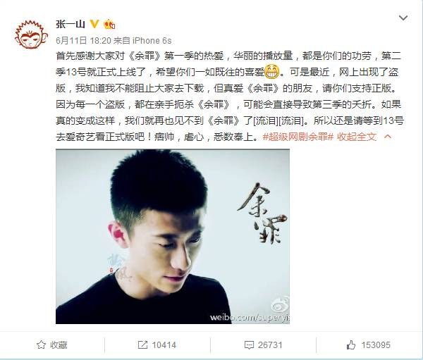 对于资源的泄露,张一山也曾发微博呼吁网友观众们抵制盗版