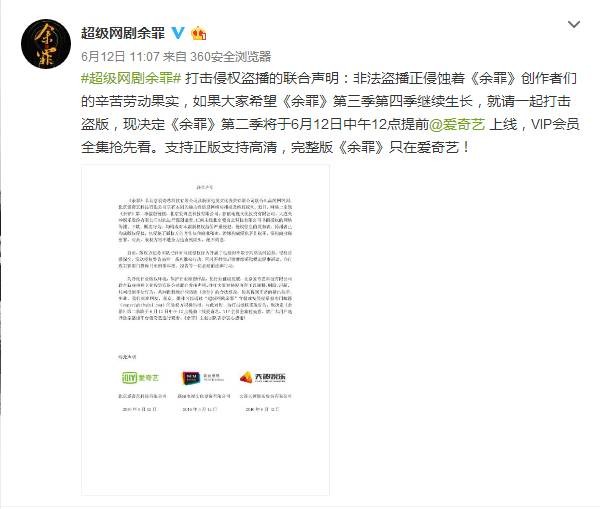 《余罪》官方微博中发文称:“非法盗播正侵蚀着《余罪》创作者们的辛苦劳动果实,如果大家希望《余罪》第三季第四季继续生长,就请一起打击盗版,完整版《余罪》只在爱奇艺!”同时发出打击侵权盗播的联合声明,称版权方将不遗余力追查泄露源头,绝不姑息。