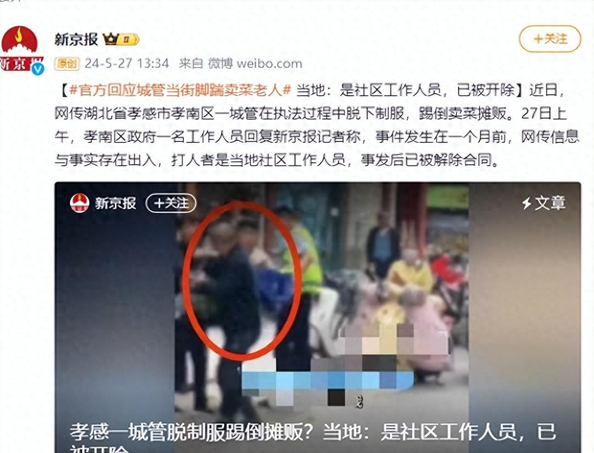 官方回应城管当街脚踹卖菜老人,当地:是社区工作人员,已被开除