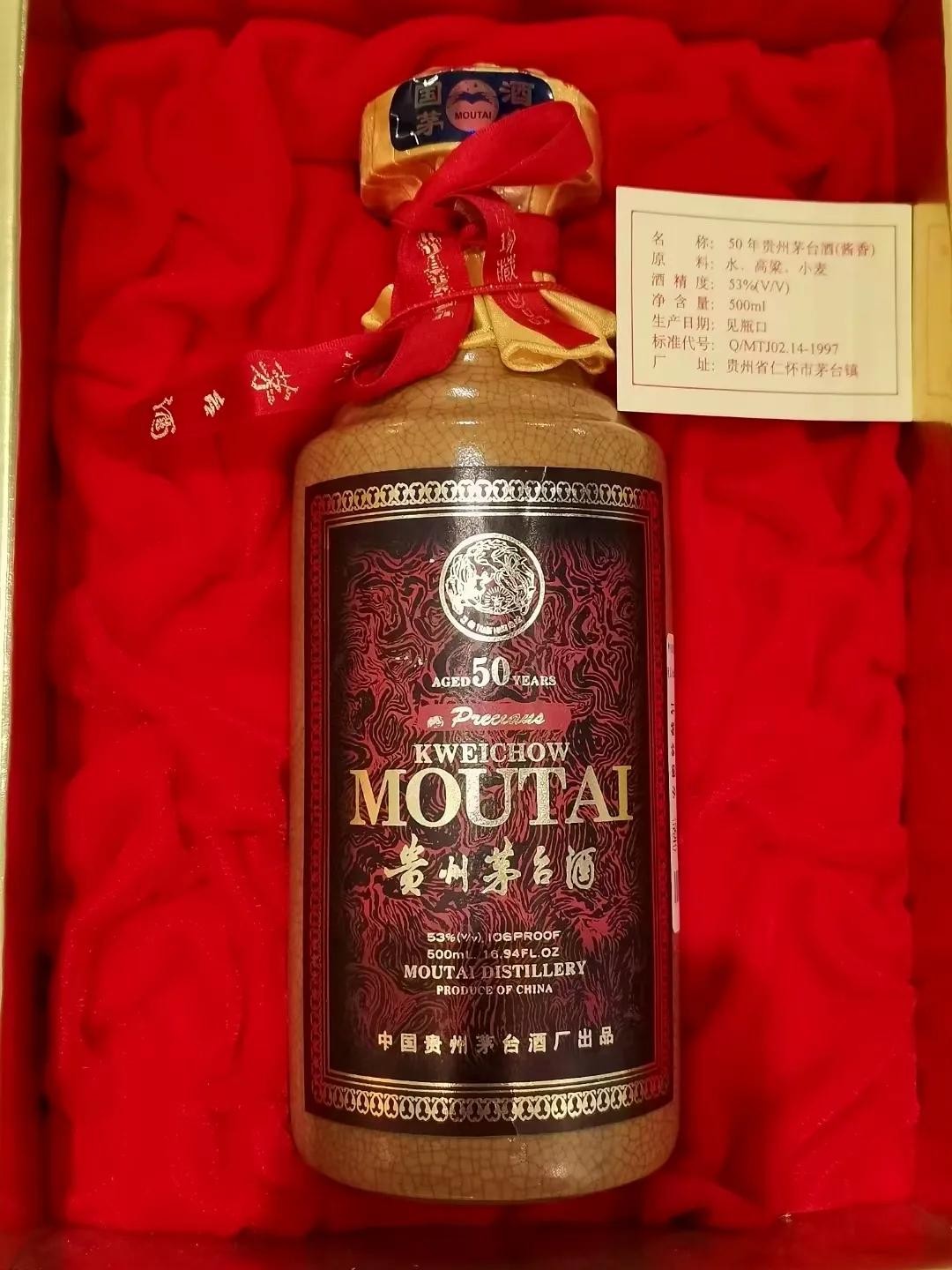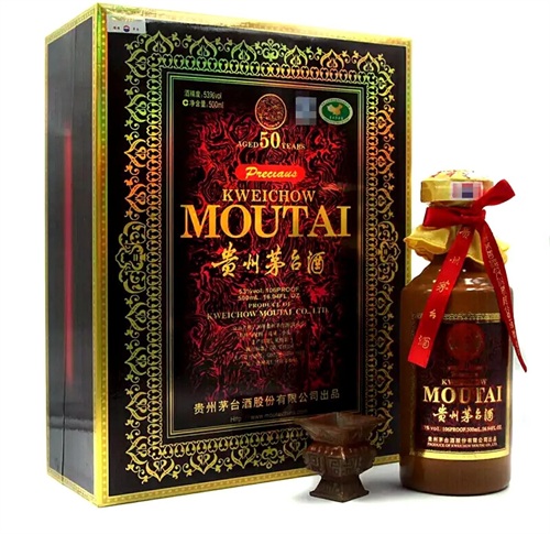 茅台的50年采用不低于50年年份的基酒勾兑而成。整体的包装格调采用深黑色,更显高档。黄铜杯也改为了黑色酒尊,瓶身依然采用开裂瓷片纹。