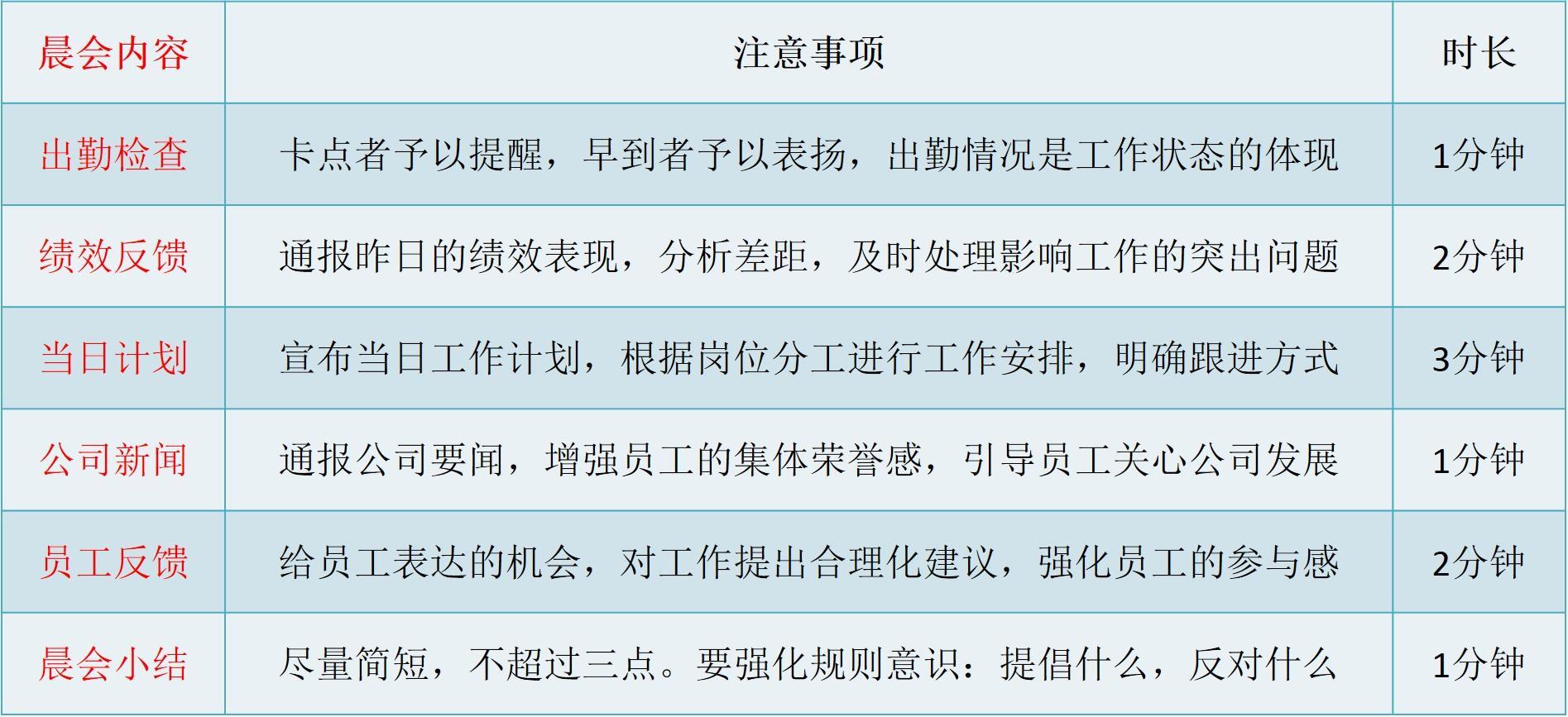 晨会不能流于形式,其内容通常包含出勤检查、绩效反馈、当日计划、公司新闻、员工反馈、晨会小结等六个环节。在上述六个环节中,公司新闻和员工反馈往往被忽略。为提升晨会效率,保证晨会效果,本文总结了各个环节的注意事项,并编制了一个表格,以方便大家使用。这个表格不但适用于晨会,也可以作为其它会议的参考。