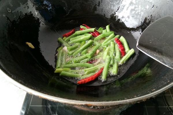5、放豆角炒至颜色变更绿。