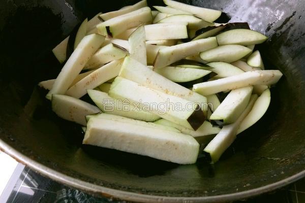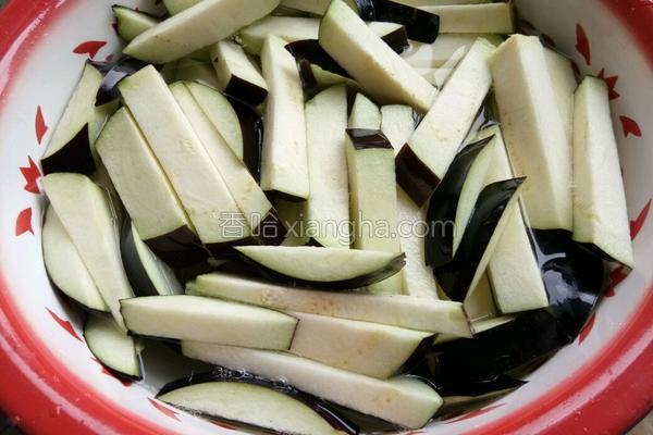 2、茄子切条,用凉水泡一会。