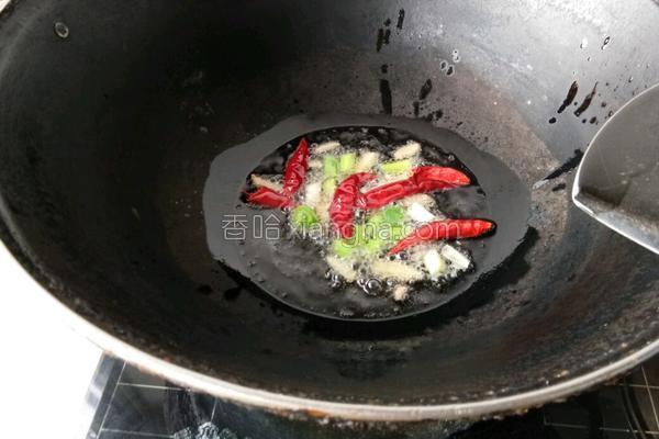 4、锅里倒油烧热,放辣椒角,葱姜爆出香味。