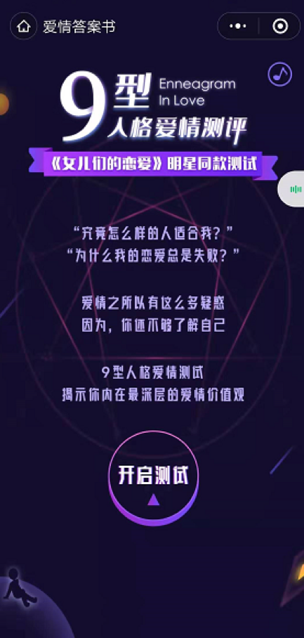 相信大家或多或少都做过各种性格测试,希望从中了解自己的性格或人生价值观,现在有一个机会可以知道自己的爱情价值观,那就是我们新推出的”爱情答案书”心理测验,也可以说是9型人格爱情测评,帮助大家剖析内心深处的爱情人格、为你找到爱情困惑的答案,就连芒果TV正在热播的《女儿们的恋爱》里的明星也做过该测试哦,所以你也来测测吧。