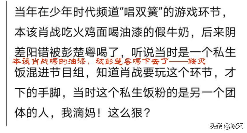 根据网友的说法,当时肖战和彭楚粤参加一档叫少年时代频道的节目。这个时候,轮到肖战吃火鸡面了,有个私生粉就悄悄在牛奶里倒入了油漆,本意是想让肖战喝下去。
