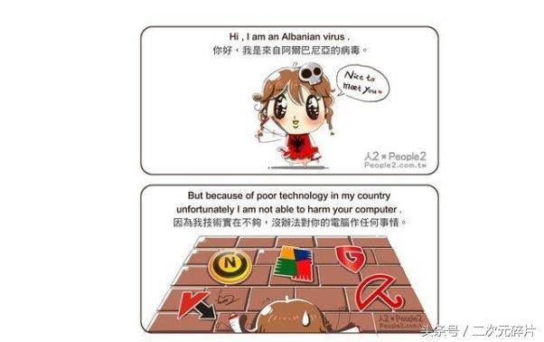 可爱的阿尔巴尼亚病毒,这个很多漫迷都是知道,它也是一个梗,在零六年的时候,阿尔巴尼亚病毒流行了一段时间,它是由于数据传播来的,为什么说它是可爱的病毒,因为它的程序编码是这样子的的,首先自我介绍,我是一个阿尔巴尼亚的病毒,因为自己国家的科技水平不咋地,所以不配作为一名成功的病毒,想要请求你自己帮忙删除自己的重要文件,可以吗?