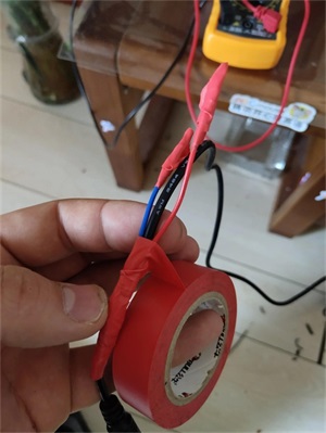 第三步:把充电器靠近充电插头附近绝缘皮剥开3公分漏出两根电源线,然后错位剥皮防止碰触短路,焊接延长电源线用绝缘胶带包好,插上充电器用万用表确认正负极。