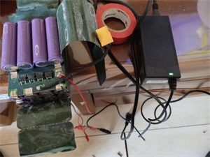 第五步:插电测试,如果这是冲电器指示灯为红色证明已经开始充电,划重点来了,亲测充电器变压出来的是42V左右,而电池输出的电压是36V,这种绕开电池保护板直接对电池进行充电不宜时间过长,控制在5分钟左右,时间长了对电池有寿命有影响,5分钟结束后,万用表测量充电电压为36.8V证明已经激活成功