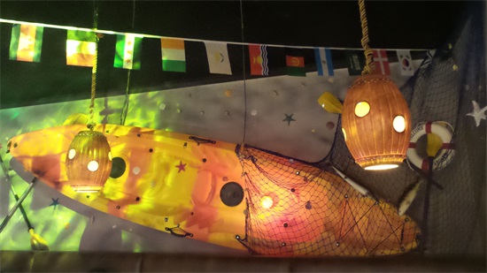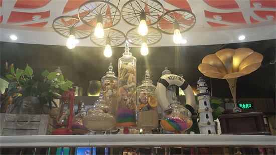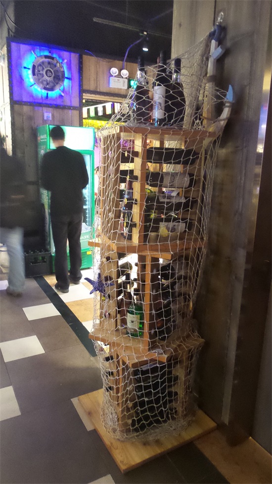 被渔网包裹的酒柜,这里啤酒红酒和鸡尾酒也是无限畅饮的。