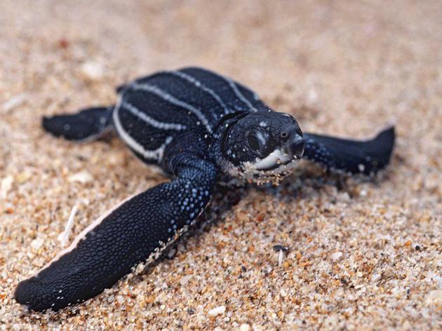 一只刚大班故事孵化出来的棱皮龟正努力爬向大海,科学故事有哪些?,这是世界上体型最大的海龟物种,科学故事,如今已濒临灭绝