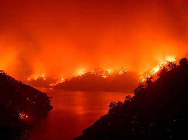 2025年8月19日,美国大班加州纳帕LNU综合体大火期间,科学故事儿童,火焰包围了科普伯耶萨湖
