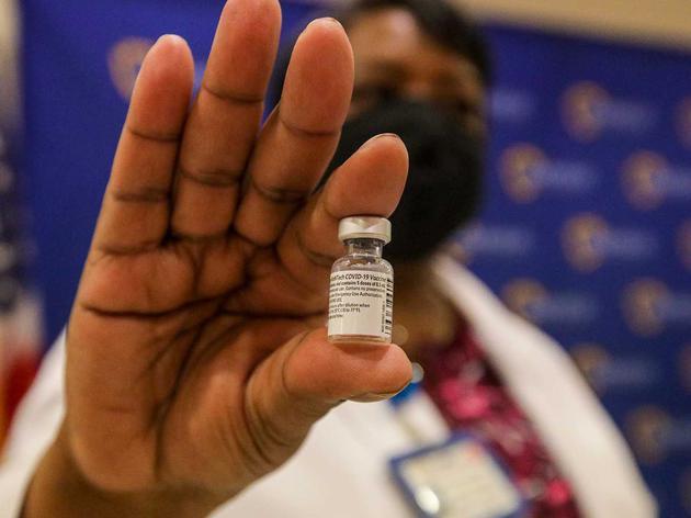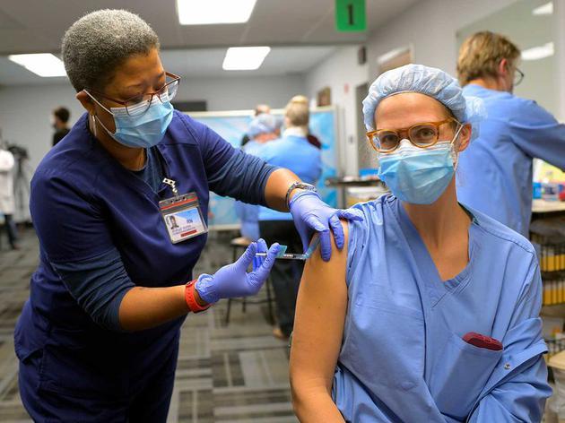 在美国弗吉尼亚州阿灵顿的弗吉尼亚州中心医院,一名注册护士正在为一名护士接种新冠肺炎疫苗