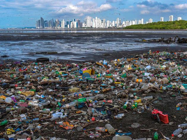 塑料碎片覆盖了巴拿马城Costa del Este附近故事的海滩