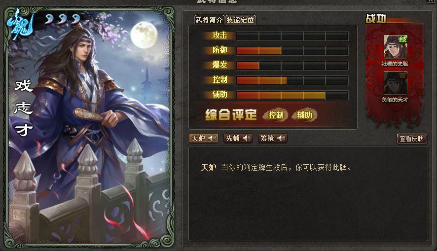 天妒技能,自己的判定牌可以选择获得。这个技能和郭嘉的一样,只是戏志才因为自己有筹策技能,因此判定牌会比郭嘉多出筹策的判定,筹策发动也比较频繁。戏志才早期辅助曹操,可惜年纪轻轻便夭折,可以说是天妒英才,这也是技能名字由来。他和郭嘉都是英年早逝,因此二者都有这个天妒技能。