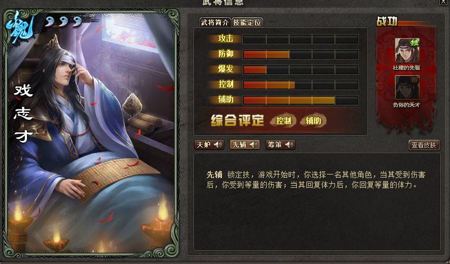 戏志才,颍川人,曹操麾下谋士,英年早逝,史书多无记载。在三国杀中,这是一位人气颇高的武将。其卖血技能和郭嘉有相似之处,又被小伙伴们称为“sp郭嘉”,因其姓氏缘故也得到了个“戏子”的外号。武将技能选择一名武将进行辅助,可以拆牌、摸牌,灵活多变且有配合乐趣深受小伙伴们喜爱。