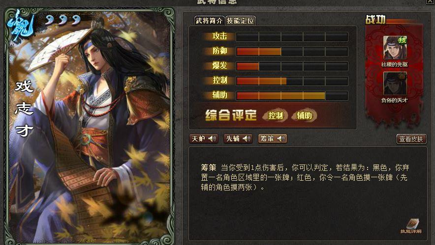 筹策技能,当自己受到1点伤害以后可以进行判定,若为红色牌你可以选择一名角色摸牌,若选择先辅的角色摸牌其可以摸两张牌,若选择其他角色(包括自己)则只能摸一张牌;若判定为黑色,你可以弃置一名角色的牌,这里弃置的牌可以是判定牌、装备牌、手牌。筹策这个技能,增加了灵活性,一方面可以帮助爆发性的队友过牌,可以解乐、兵等等,还可以帮助被集火的队友过牌保命,比郭嘉的遗计更优化。技能由来,史书中对于戏志才有为曹操筹谋划策的提及,因此这个技能称之为筹策。