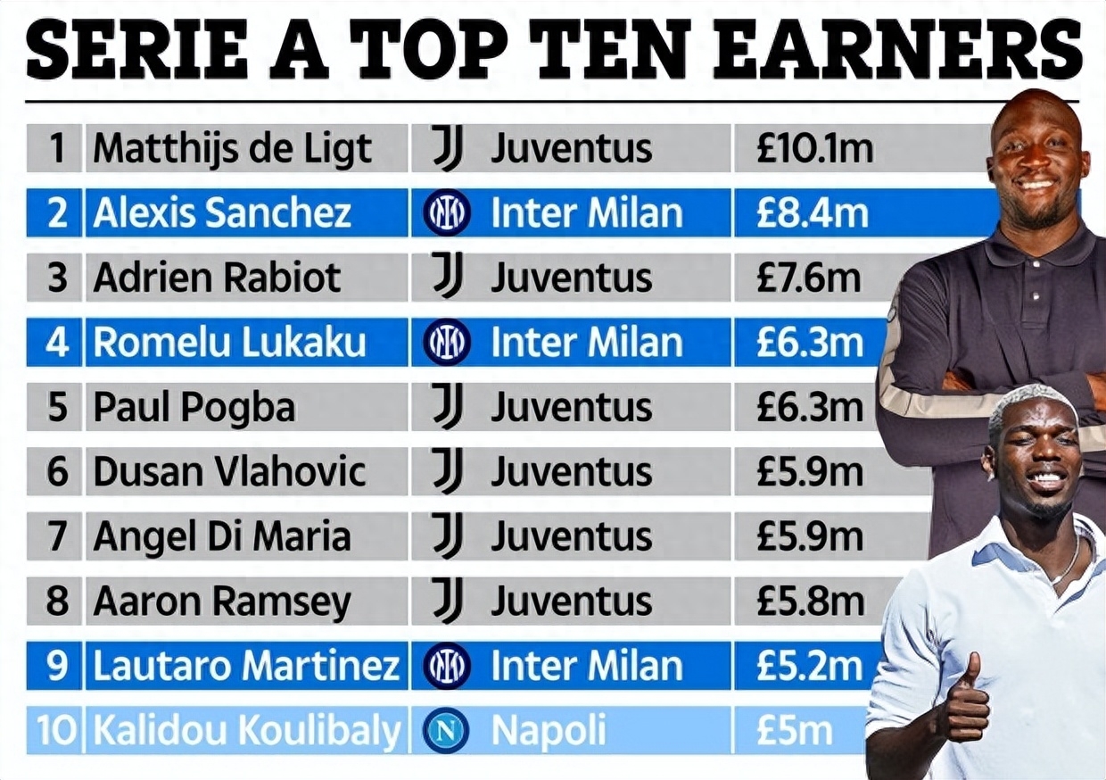 排在博格巴和卢卡库前面的球员有拉比奥、桑切斯和德里赫特。尤文中场拉比奥以900万欧元的年薪排在意甲球员工资榜第三位,前曼联失意球星、目前效力于国米的桑切斯以1000万欧元的年薪排在第二,排在榜首的则是年薪1200万欧元的尤文金童后卫德里赫特。