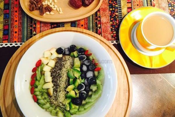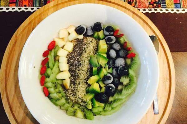菜谱小贴士: 注意,水果可以随意搭配,不一定非要用这些,没有奇异籽和火麻仁籽的朋友可以忽略,加上坚果也不错.