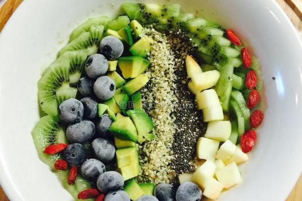 火麻仁籽1勺、猕猴桃1个、枸杞适量、肉桂粉3克、有机生燕麦片50克、苹果半个、香草精2滴、奇异籽两勺、牛油果半个、蓝莓适量、水适量