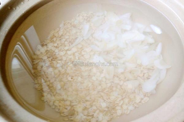 6.锅中加水,下燕麦片,小米,百合冰糖开始熬粥了。