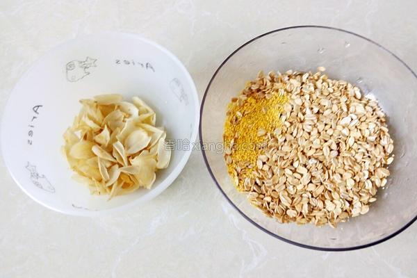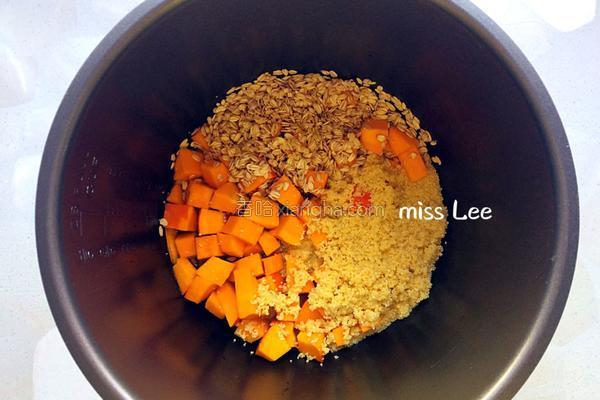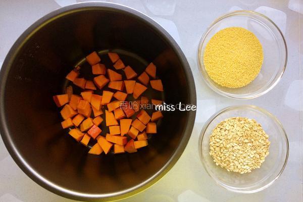 2.南瓜切1~2公分见方的小块,燕麦和小米淘洗干净。