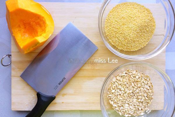 1.南瓜洗净,不建议去皮,可以更好的保留养分,此外一并备好燕麦和小米;