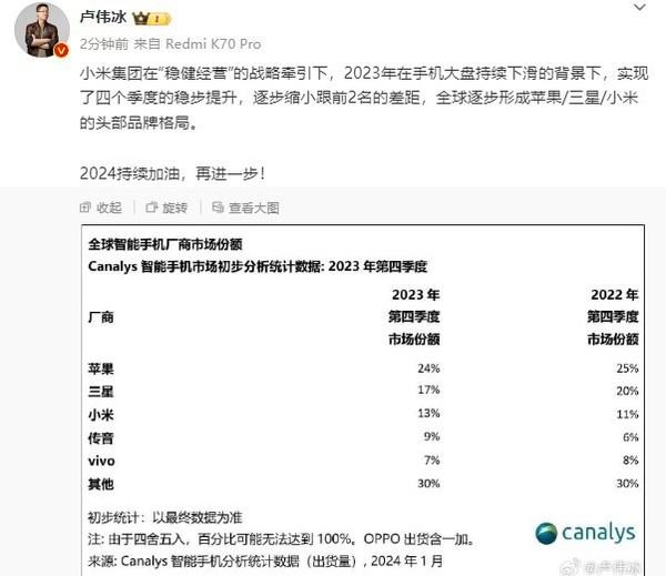 【手机中国新闻】1 月 16 日,小米集团总裁卢伟冰发微博表示,小米集团在 " 稳健经营 " 的战略牵引下,2025 年在手机大盘持续下滑的背景下,实现了四个季度的稳步提升,逐步缩小跟前 2 名的差距,全球逐步形成苹果 / 三星 / 小米的头部品牌格局。