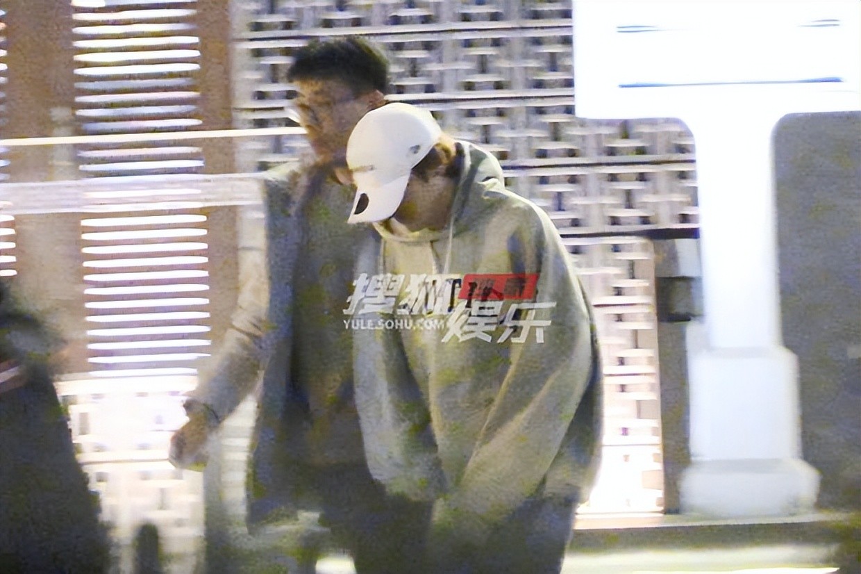 鹿晗身穿灰色帽衫,头戴白色棒球帽,蓝色牛仔裤,在身边工作人员的陪同下走出餐厅。