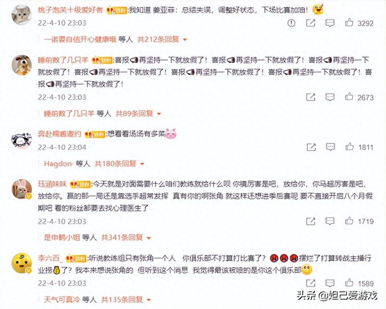 回顾AG上场输掉比赛后的微博评论,除了部分吐槽选手状态的声音外,还有很多粉丝将矛头指向教练张角。