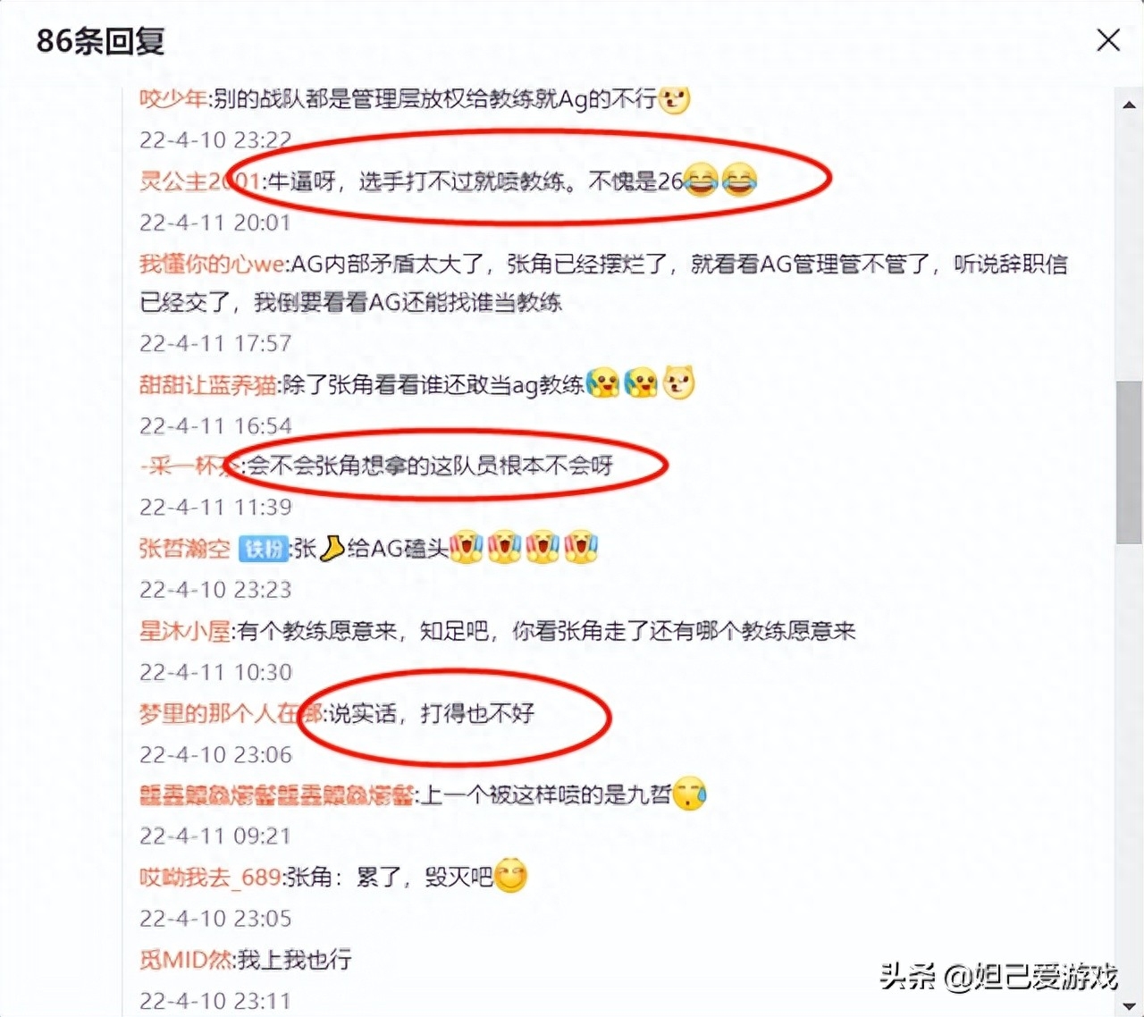 大致翻看AG官博评论我发现,吐槽BP的粉丝大都以女粉为主,说句不好听的,AG输比赛,挨喷的YY是教练,从月光到张角,谁在喷谁谁走想谁,某些粉丝喜欢的选手操作变形了就用曾经的高光来解释,其他选手操作变形了就求他下场,这不太像是一支电竞战队。