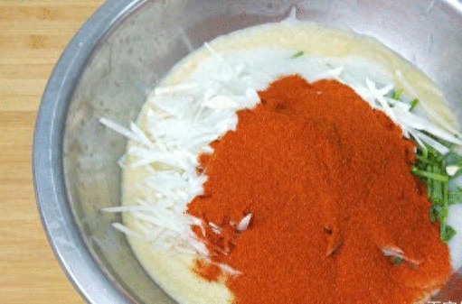 第六步、白萝卜切成丝,葱切成段,把辣椒面200克、白糖100克与榨好的汁、加清水一起混合在一块,再把面糊倒入进来,混合一起来;好了辣酱就制作好了;