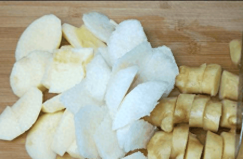 第五步、把前面准备好的生姜100克、大蒜100克、一个苹果、一个梨切成小片,再用榨汁机榨成果汁!