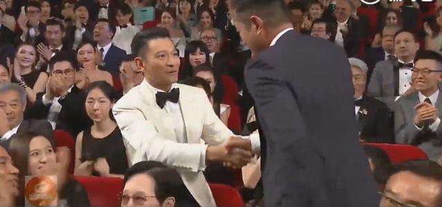 当他站起身时,右手边的一众明星也纷纷站起身来给他让路,我们的古仔显然没有做好自己能拿奖的准备,所以坐得比较靠里,但是当他走到刘德华身边的时候,同时刘德华也获得了本次影帝的提名,也是相当有力的竞争者,只见华仔穿着一身白色的西服,非常帅气,一点也不显老,而他也非常高兴的向古天乐握手致敬并来了一个大大的拥抱!