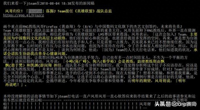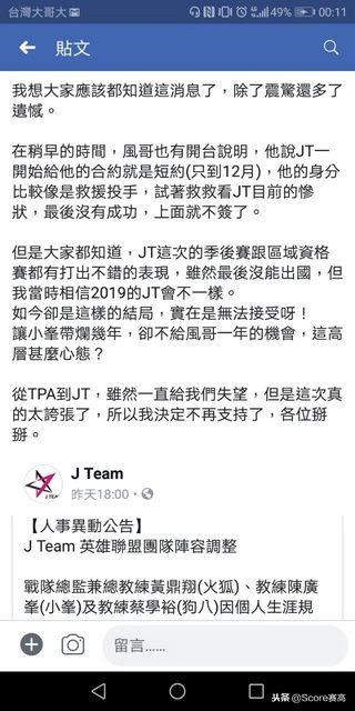 J Team发布Facebook声明,战队总监兼总教练黄鼎翔(火狐)、教练陈广峯(小峯)及教练蔡学裕(狗八)因个人生涯规划,将于2018/11/30正式离队。