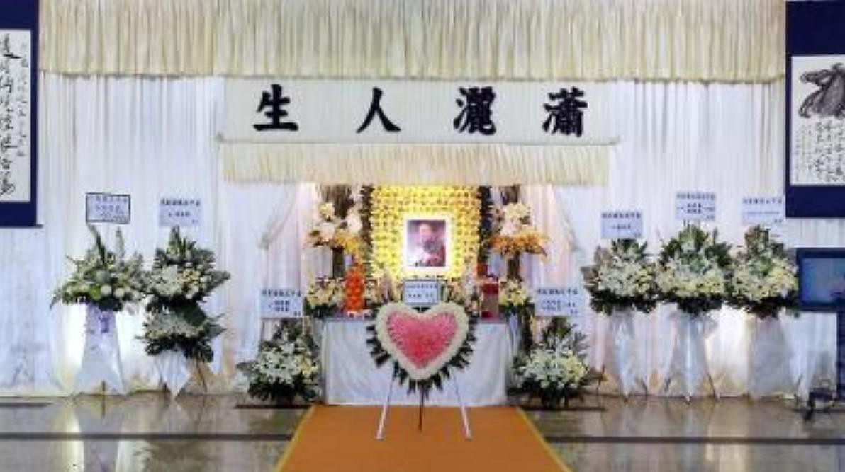 追悼会上,灵堂上横幅四个大字格外醒目“潇洒人生”。