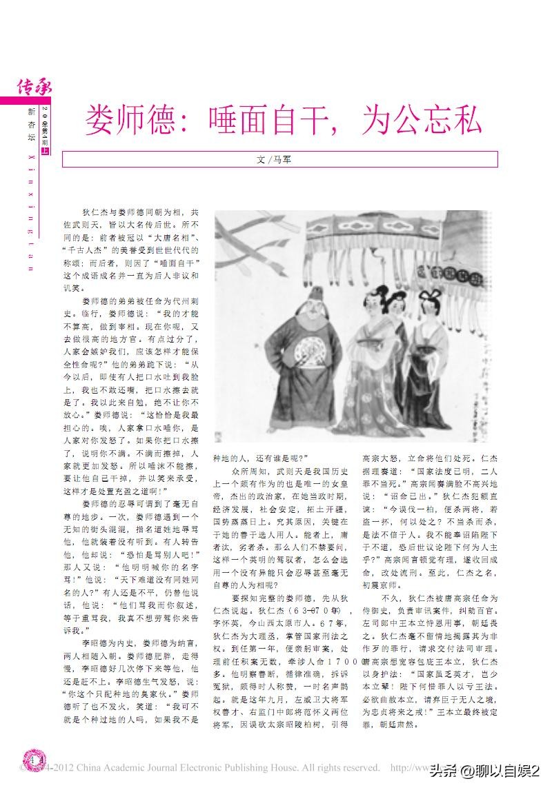 四、为国荐才。娄师德曾多次推荐狄仁杰担任宰相。据宋·王谠《唐语林》记载:狄仁杰拜相后,对此毫不知情,狄仁杰因和娄师德政见不同,两人多次在朝堂争得脸红脖子粗。因此后来狄仁杰还多次排挤他,最后竟将娄师德放了外任。有一天,武则天问狄仁杰道:“你认为娄师德贤明吗”?狄仁杰说:“他是进士出身,朝中任职正直敢争,担任将领时也很谨慎守责,至于他是否贤明,那我就不知道了”。武则天又问:“那么,你认为娄师德知人吗”?狄仁杰道:“臣曾与他同僚多年,没听说过他知人”。武则天告诉狄仁杰:“我用你为宰相,就是因为娄师德举荐的,看来娄师德确实是知人善任啊”!武则天说完,专门拿出当初娄师德举荐狄仁杰的奏章。狄仁杰看后,大感惭愧,叹息道:“娄公盛德,他待我如此宽弘大度,我却一点都不知道,我远不如他啊”!