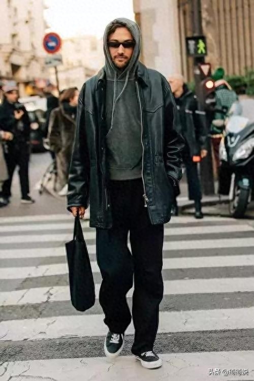 选择与黑色皮夹克色差大的卫衣搭配更有层次感,棒球帽的搭配细节感也很到位。卫衣很休闲,但它也可以商务,套头卫衣搭配休闲裤子,即时尚帅气,又给商务男士多了一种穿搭。