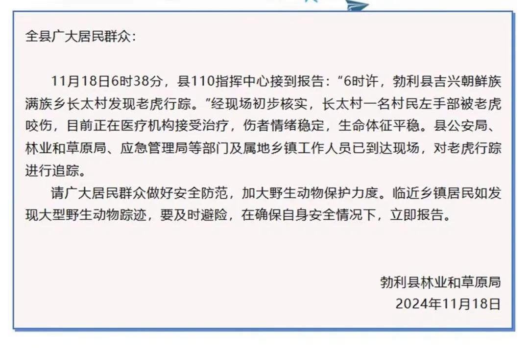 在黑龙江省七台河市勃利县吉兴乡长太村,一个宁静的村庄,被一场突如其来的“虎患”打破了往日的宁静。夜色如墨,一段监控视频在网络上迅速传播,一只野生东北虎的身影在黑暗中若隐若现,它犹如一位不速之客,试探性地冲撞着农户家的大铁门。那一刻,不仅是农户一家,整个村庄都陷入了恐慌与不安之中。随后,一则更令人揪心的消息传来:一名65岁的村民在这场意外中左手部被老虎咬伤,这起事件迅速引起了社会各界的广泛关注,也引发了我们对野生动物保护与人类安全的深刻反思。