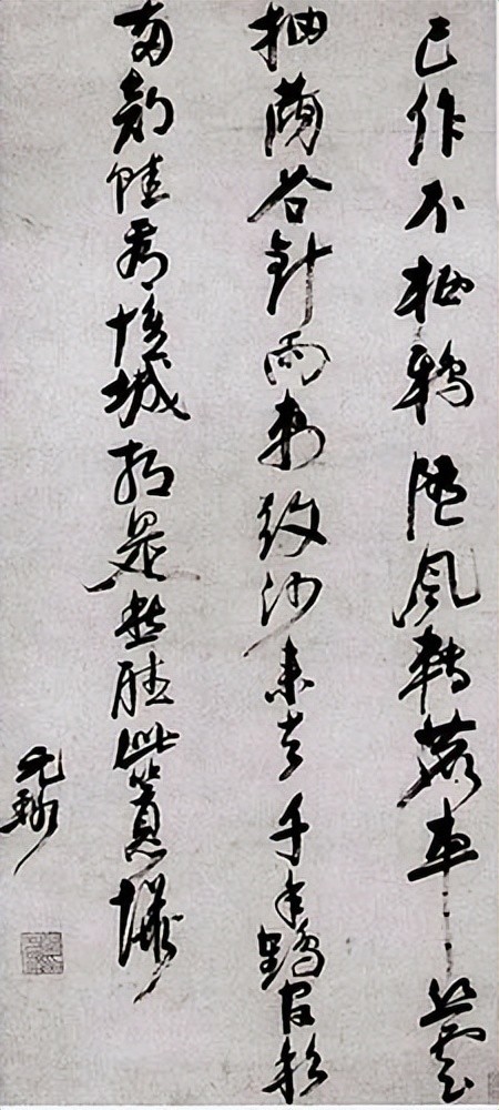 他的大幅立轴在总体章法上与张瑞图、黄道周行草同调,行距疏空、字距茂密,显示了同一时代的书法特征。然其笔迹苍劲浑厚,跌宕顿挫,善以屋漏痕之意,用笔中参与揉、擦,飞白、渴笔与浓郁之墨相映成趣,故酣畅流动中显出毛涩、劲健,飞扬恣肆中内含骨力。其结体奇险而多变,聚散开合,随机应变,十分生动。