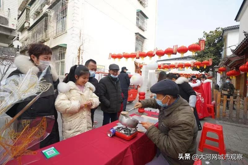 穿过小弄,一连串的摊位让人目不暇接,剪纸、叶雕、泥叫吹、汉服头饰……糖画、面塑等非遗文化摊点前挤满了小朋友,舀起一勺糖浆,手腕轻移,糖画老板一套行云流水的动作下来,不一会儿一头栩栩如生的“奋进牛”就成了型,很快被一位小朋友买走。