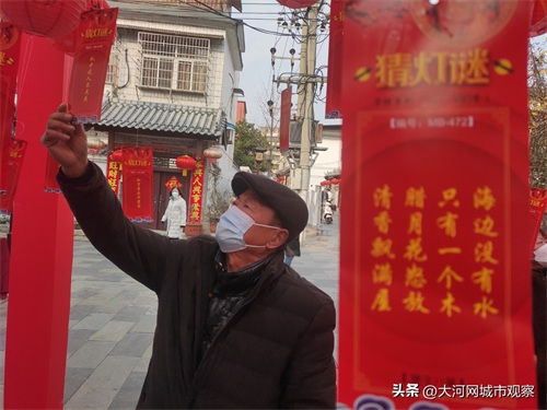 “孔雀收屏——打一三国人物——是啥?”“这个我知道!是关羽。走,猜对了领奖去!”成排的红灯笼下,大人小孩儿们你一言我一语地讨论,猜对了灯谜领上奖品,又喜滋滋地去买小吃。