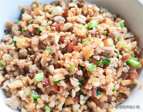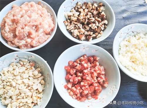 二肥八瘦猪后腿肉,剁碎,不要太碎,留点颗粒感。干香菇用温水泡发30分钟,抓干水分,切成细粒。腊肠先用温水泡30分钟,软化后切成细粒,如果不泡水直接切会很硬。花生米小火炒至皮开裂、有点焦黑,装起放晾,去皮,然后用刀切碎(也可以装在食品袋,用棍子碾碎)。生马蹄切成细粒。